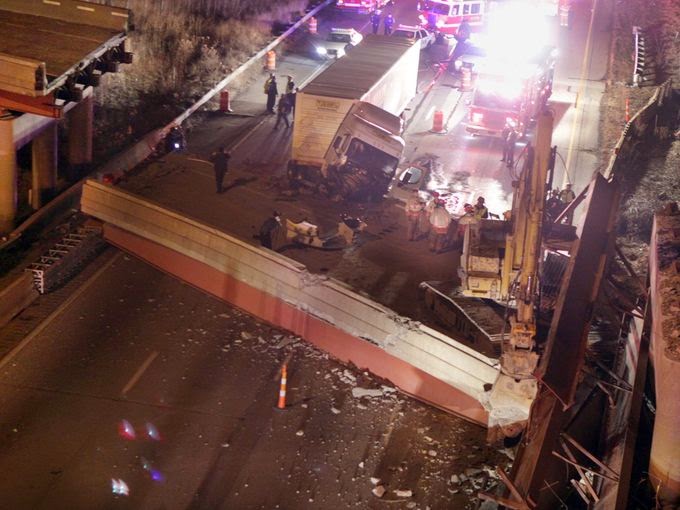 Fire officials said the tractor-trailer struck the collapsed section as the bridge hit the ground. They said the construction worker was killed in the collapse. His name was not immediately released.
