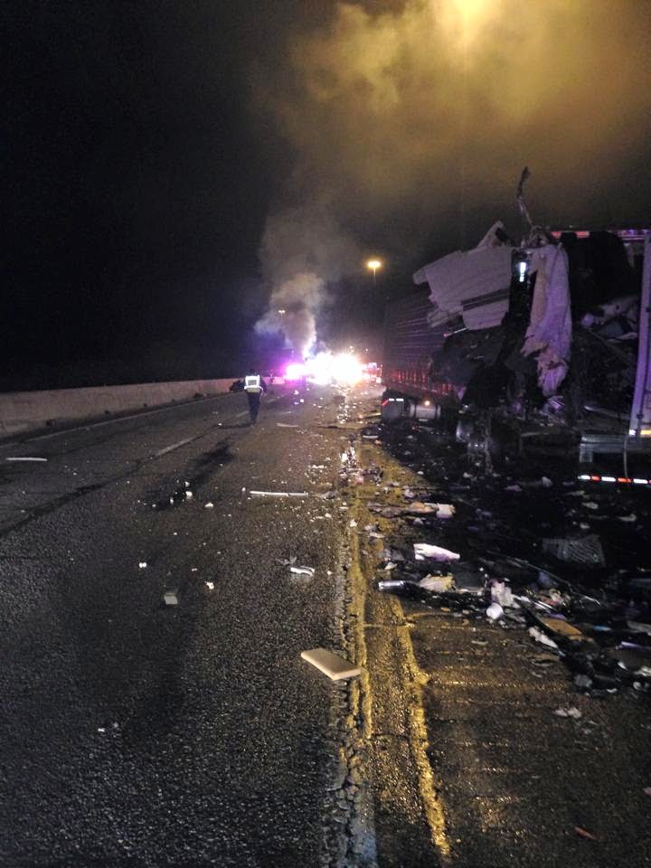 Fire department officials say the vehicle was licensed out of Mexico and was hauling a load of television sets when it struck the 18-wheeler. On impact, the TVs were ejected from the car. The vehicle had a sleeping chamber in it, where a passenger was asleep. Officials say the person likely never woke up during the wreck.