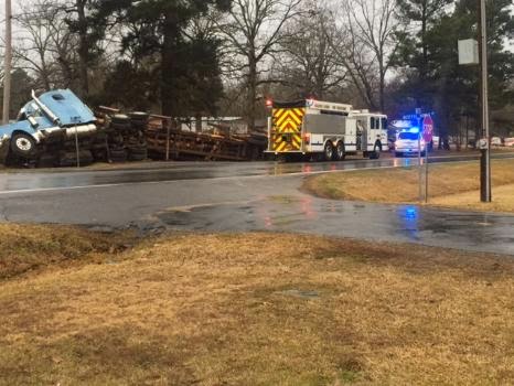 scene and it appears an 18-wheeler carrying logs has flipped over on its side