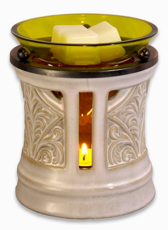 a ceramic warmer with a metal stand and a glass dish to hold the wax