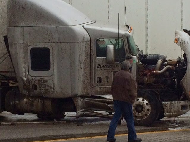 The driver of the truck said he hit a slick spot in the road about and his trailer began fishtailing. He was unable to get the vehicle under control and the truck traveled about half a mile before crashing into the concrete wall of the median and jack-knifing. The driver was not injured in the crash.