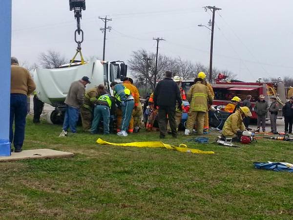 AFTER FLAT BED TRUCK LANDS ON TOP OF CAR IN LORENA, TEXAS. THE TRUCK VEERED OFF THE ROAD, HIT THE SCHOOL
