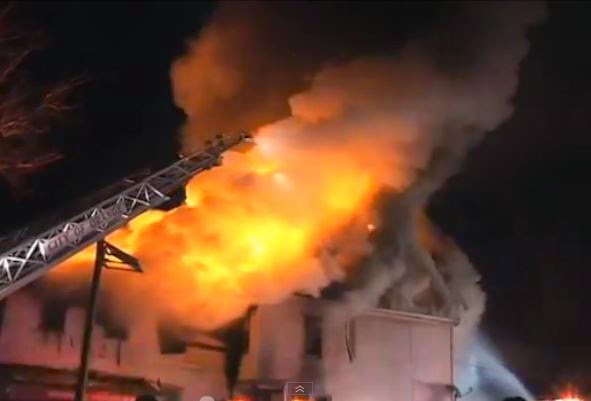 The fire started in the basement of the occupied building and spread to an abandoned home. Firefighters said attempting to battle the flames on the icy ground was like "being on ice skates"
