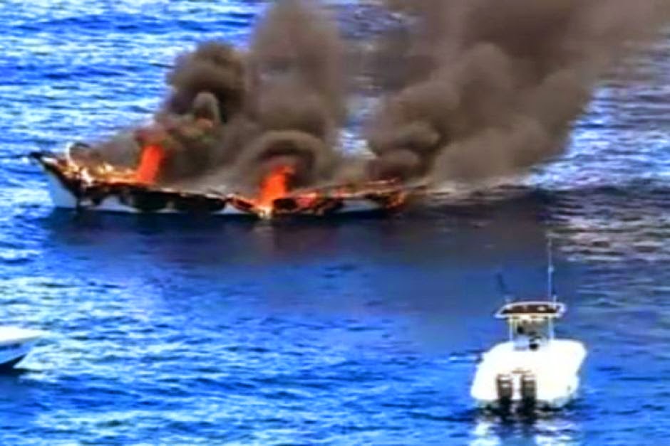 fire started on the 40-foot boat just after 11:00am about 25 kilometres off