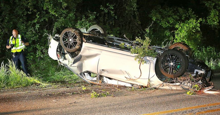 northbound lane and the badly damaged Toyota on its roof in the southbound