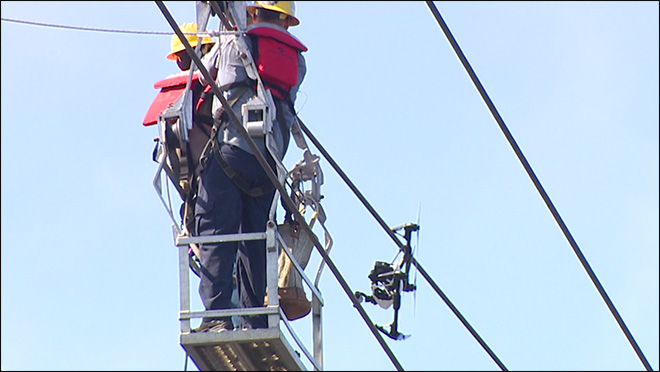 On Saturday, crews de-energized the line and raised a large basket into place as curious neighbors looked on. It took a few minutes for two workers to slide across the line and free the drone.