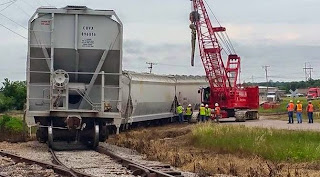 As of 12:30 p.m. the crane to re-rail the cars was en route