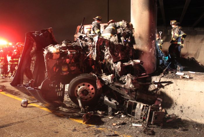Officials said the driver lost control of the vehicle and struck a support beam, which caused the semi to burst into flames.