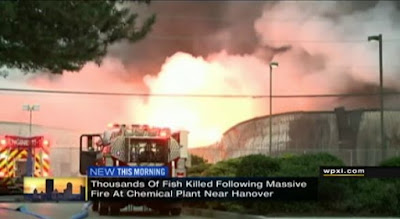 in the water following Monday’s fire at Miller Chemical and Fertilizer Plant in