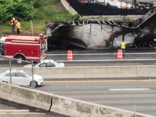 veered, hit the wall of an overpass and burst into flames. The truck's tires