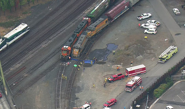 According to a BNSF Railway spokesman, Gus Melonas, the trains — one owned by Union Pacific and the other by BNSF — crashed at 10:45 a.m. while traveling between 5 and 8 mph where tracks converge about a half mile north of the Tacoma Amtrak station.