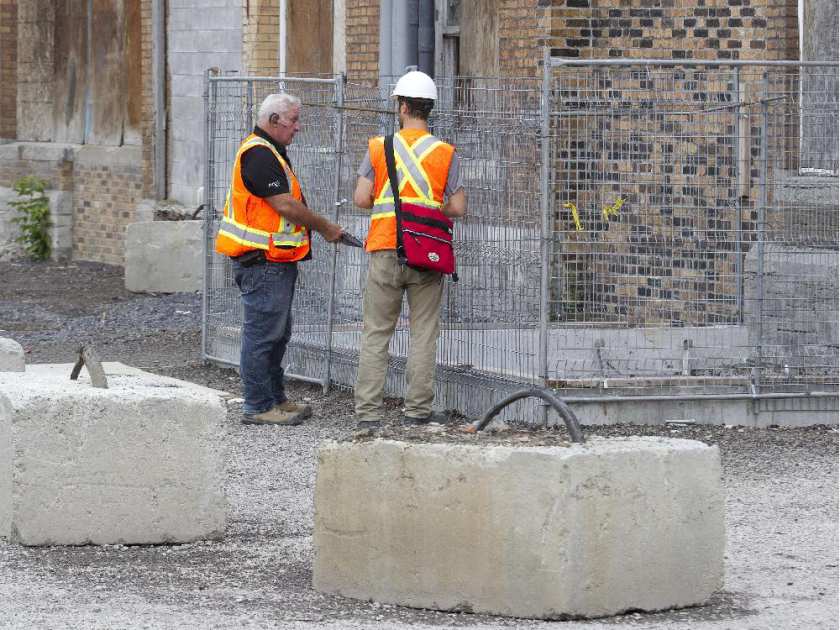Workers and a CSST investigator examine a hole behind a building at 755 Berri into which a worker fell, Aug. 20, 2015. Phil Carpenter / Montreal Gazette
