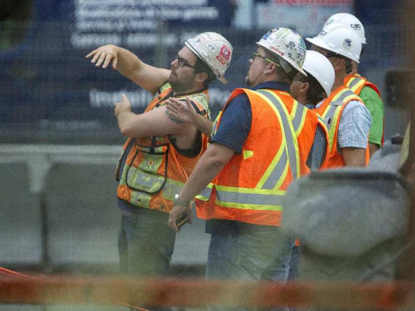 Workers gather underneath the Bonaventure Expressway at Mill Street where a worker fell Aug. 20, 2015. Phil Carpenter / Montreal Gazette