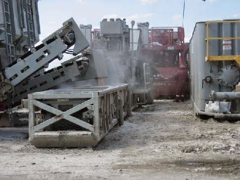 Alberta-based Calfrac Well Services implemented its own fix, called “Sandstorm,” to deliver and process sand at a frack site. The system contains sand through covered conveyor belts, enclosed storage containers and a remote controlled robot.