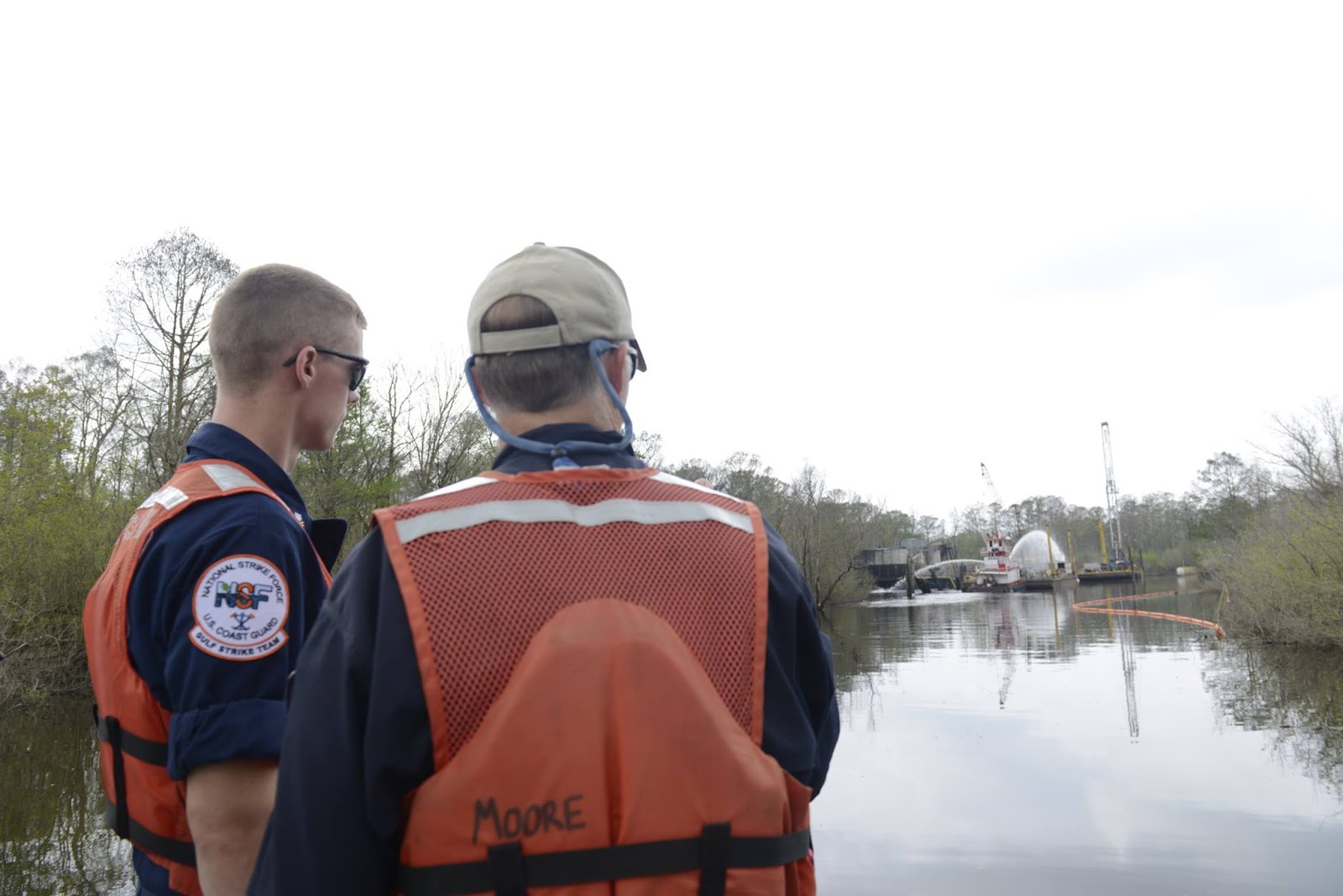 Petty Officer 2nd Class David Nelson, Coast Guard Gulf Strike Team, and Chris Viator, with the Louisiana Oil Spill Coordinator's Office, survey the scene of the Berry Lake oil production platform fire, Mar. 16, 2016. Response crews extinguished the fire around 1 p.m. and will continue to monitor the scene. U.S. Coast Guard photo by Petty Officer 3rd Class Lora Ratliff.