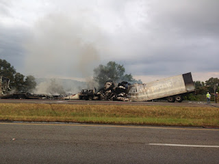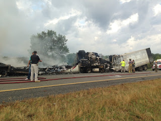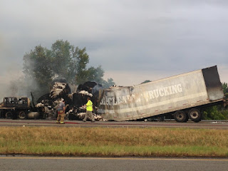 Apparently one truck strayed over into the eastbound lane and struck the other truck near the right shoulder of the road. Fire medics and fire crews are currently on the scene. The east bound lane has been completely shut down.