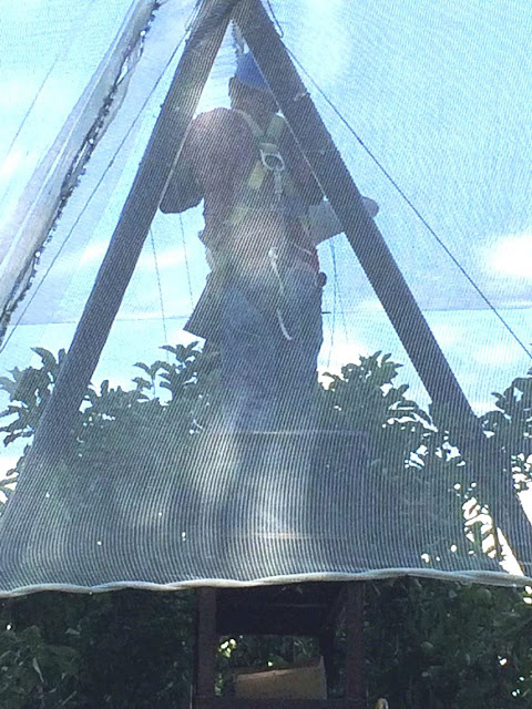 Orchard worker using fall protection (full body harness with lanyard) while working from a powered platform to maintain an orchard shade cloth system