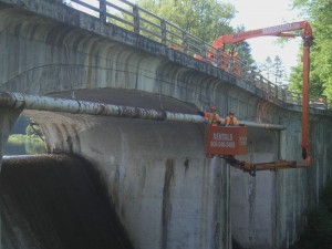 The equipment was the Aspen A-75 and was leased from Bridgeriggers. The A-75 is the largest of under bridge machines with a 75’ maximum horizontal reach. The A-75 also provides 16′ of vertical reach through the use of its telescopic 4th boom section. This feature enables the crew to do a close-up inspection in between the deepest bridge girders and beams under the bridge deck.