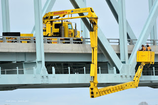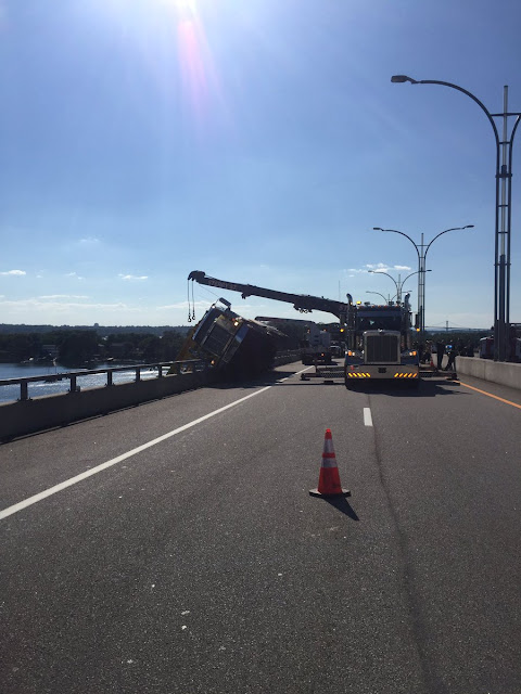 Two contractors from a private company were in the crane bucket when the truck tipped. A second vehicle, almost identical to the first one, was called to the scene to rescue the workers, Malachowski said. They were transferred from one bucket to the other and returned to the bridge.