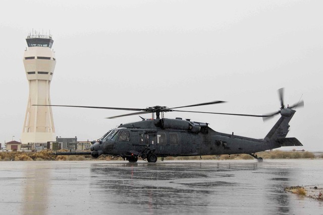 An HH-60G Pave Hawk helicopter from Nellis Air Force Base — similar to this one shown at Edwards Air Force Base, Calif. — crashed at 10 p.m. Thursday, Aug. 18, 2016, at the Nevada Test and Training Range, injuring four crew members. (U.S. Air Force photo/Christopher Okula)