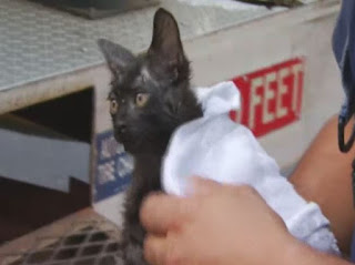 "She's all right, a little scared," Grissler said as the kitten meowed. Officers named the cat Smokey, but a firefighter said firefighters had named it Deerfield. Grissler said the kitten was going to be taken to a veterinarian to be checked.