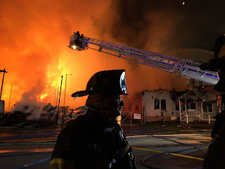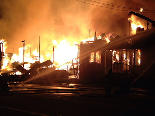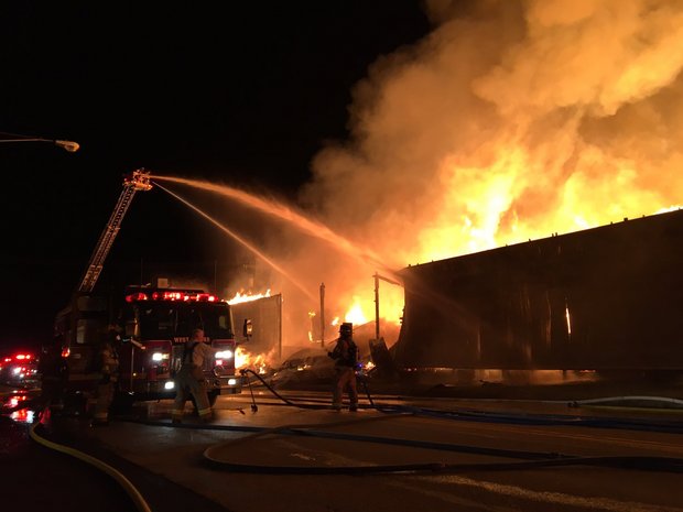 A massive blaze at Lafferty and Co. Inc. lumber yard burns $1 million in wood; motorcycle shop may be total loss