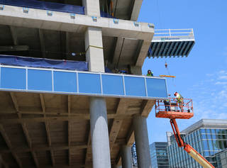 Glass is starting to go up on the BOK Park Plaza tower as work continues on the 27-story tower and two adjoining parking garages.