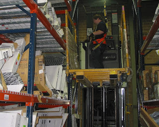 A 35-year-old warehouse worker died after falling 10 feet from an elevated forklift platform. On the day of the incident, the victim and a co-worker were adjusting warehouse shelving. The victim parked the forklift, elevated the platform to approximately 10 feet, walked out onto the platform and fell off the open end, landing on the cement floor. The victim was wearing a body harness; however, his lanyard was not connected to the anchor point on the forklift. The victim died eight days later.