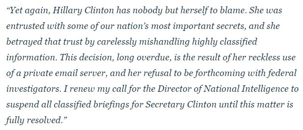 "She was entrusted with some of our nation's most important secrets, and she betrayed that trust by carelessly mishandling highly classified information," Ryan, R-Wis., said in a statement. "This decision, long overdue, is the result of her reckless use of a private email server, and her refusal to be forthcoming with federal investigators. I renew my call for the Director of National Intelligence to suspend all classified briefings for Secretary Clinton until this matter is fully resolved."