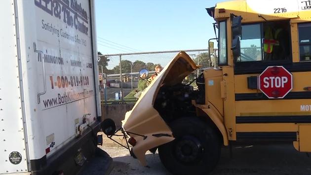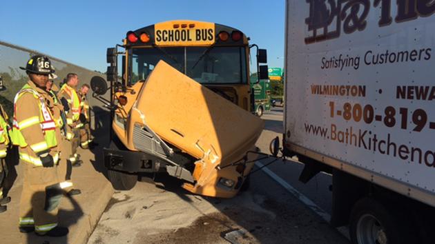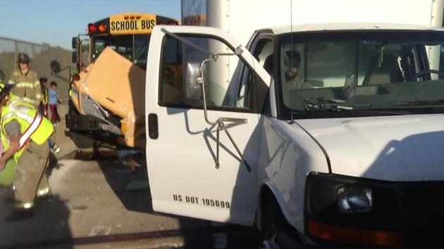 Police say a school bus struck the rear of a box truck that had slowed down for traffic.