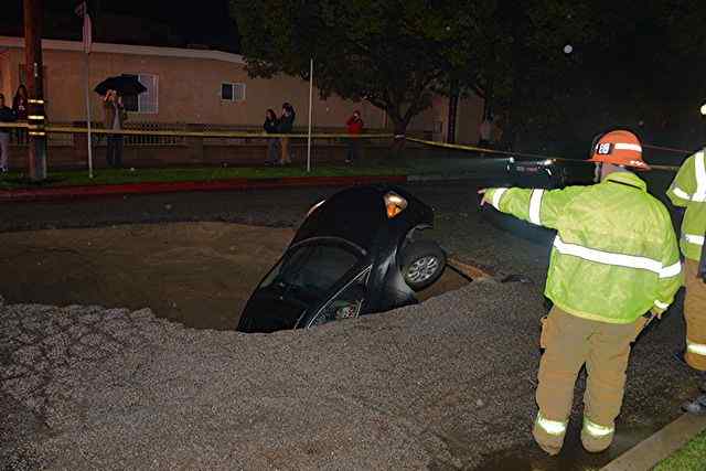 Firefighters arrived shortly after 8:15 p.m. at 4245 N. Laurel Canyon Blvd., two blocks south of Moorpark Street, and find one car upside-down in a large dark sinkhole full of rushing water, said Erik Scott of the Los Angeles Fire Department.