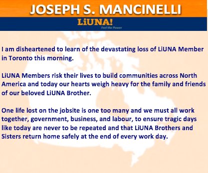 Mancinelli identified the worker as a 35-year-old pre-cast concrete erector with LiUNA Local 506.