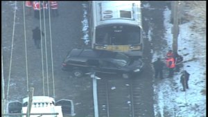 MALVERNE, NY — An LIRR train smashed into a car with a passenger inside Monday morning, LIRR officials said.