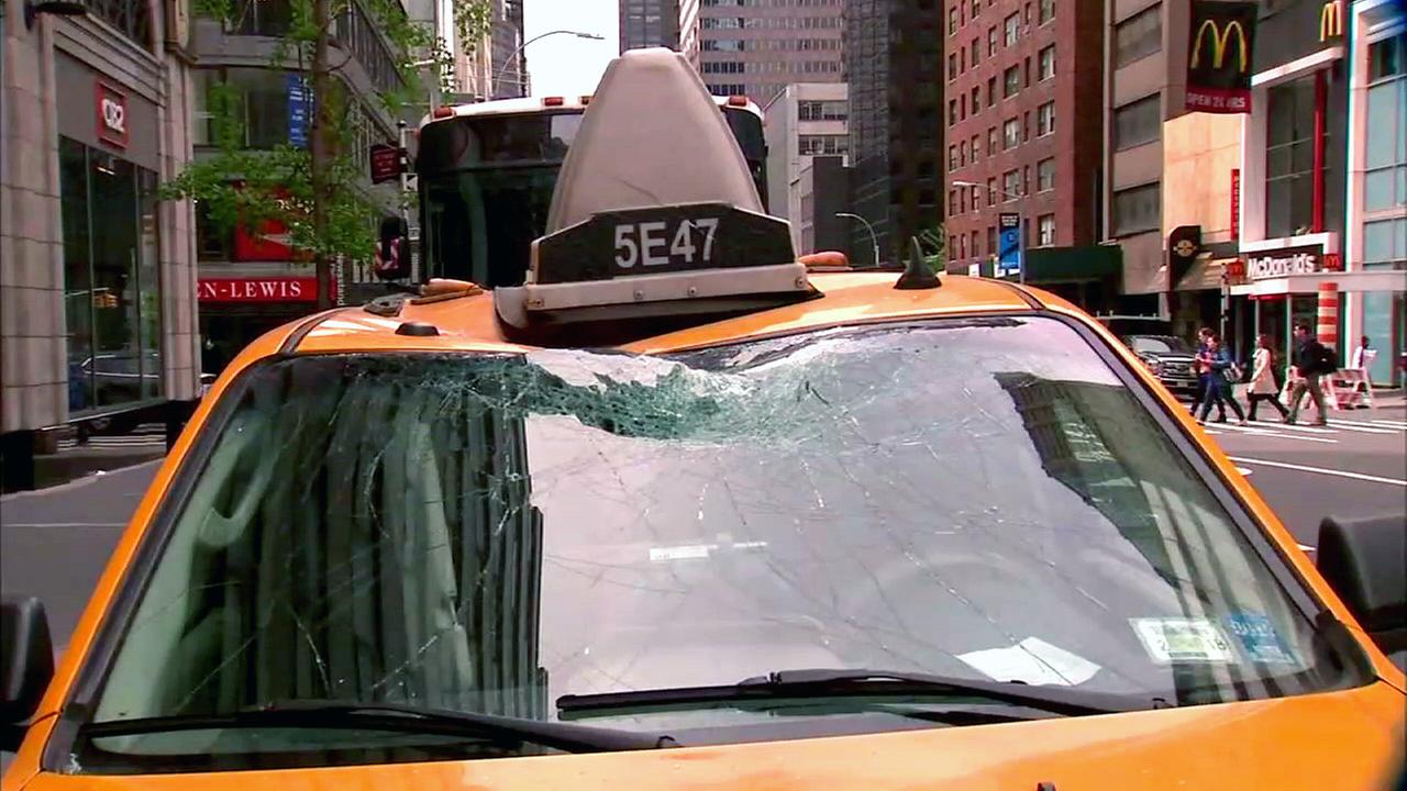 A crowbar plunged onto a yellow taxi cab on Manhattan's East Side Thursday morning, smashing the windshield and spraying glass inside the vehicle, buildings officials say.