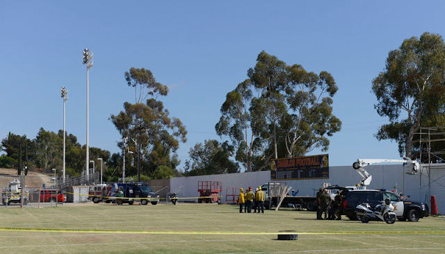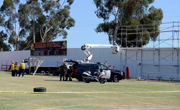 The three-man crew was working to hang a banner for a school event on the school’s field, but a spokeswoman for the Saddleback Valley Unified School District said the company was not hired nor authorized by the school district, though they were working on school grounds.