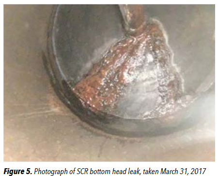 On Friday, March 31, 2017, employees again noticed a leak from the bottom of the vessel. Photos taken by the employees revealed leaks coming from at least two distinct sections of a 6-inch ring of original tank material that had been left surrounding the replacement center section of the vessel in 2012. Three days later, on April 3, Loy-Lange started up the steam generation system and the vessel ruptured in the area of that ring.