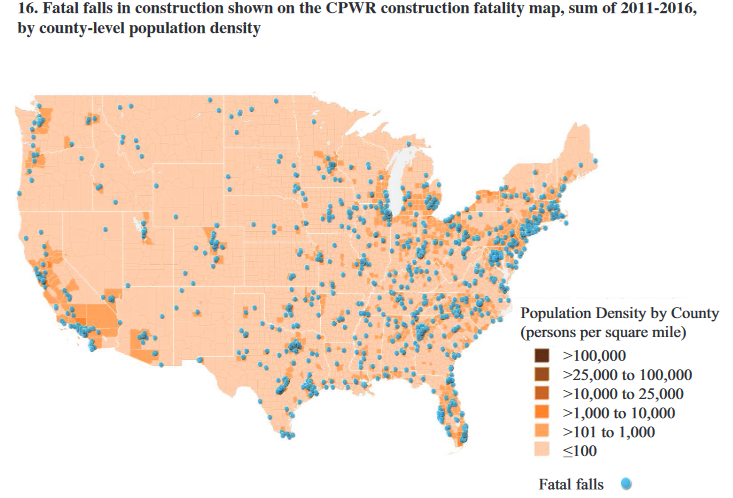fatalities in this industry. The clusters of fall fatalities shown on the CPWR Fatality Maps were consistent with the BLS data, illustrating the positive correlation of fall injuries with population density and construction activity.
