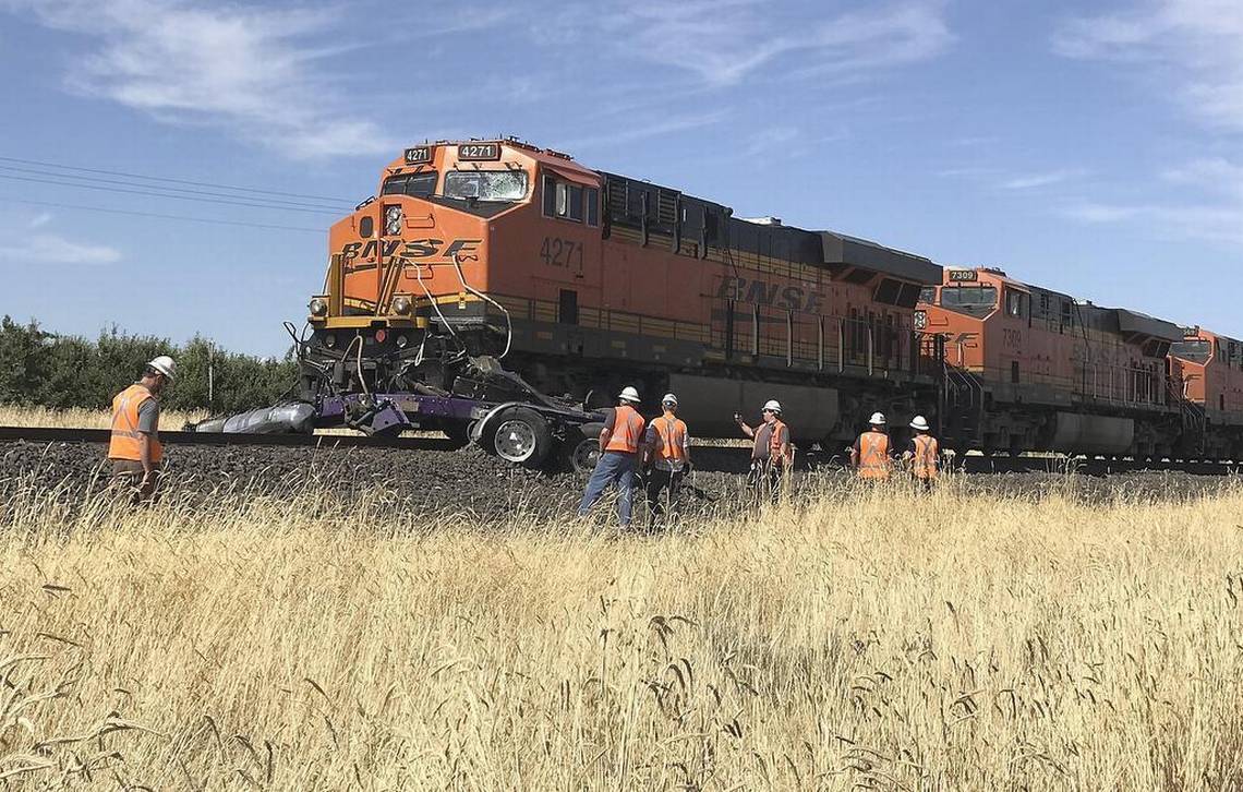 Officials told KEPR-TV News that responders found what was left of a semi attached to the first train engine in flames.