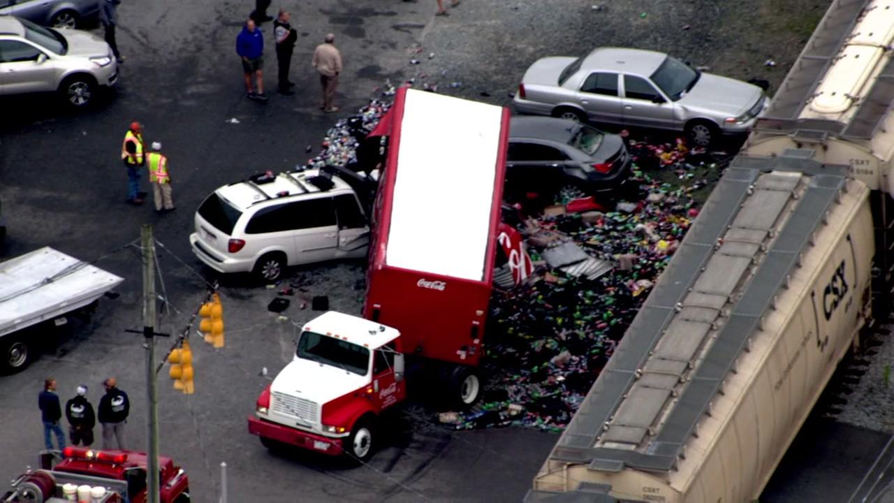 Officials tell ABC11 that a CSX train struck the Coca-Cola truck, causing it to slam into several vehicles that were parked at a nearby cafe.