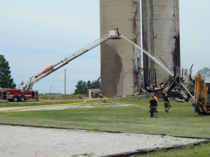 The wood building between the concrete silos was the first to fall, and it took crews more than eight hours to put out the blaze.