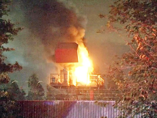 The charred remains of the crane can now be seen at the center.