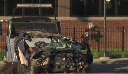 Most drunk-related accidents occur in the early a.m. hours, like this one. One of the drivers sped past the red light and collided with the other one at high rate of speed. Our bet is that the cop was the drunk one.=============