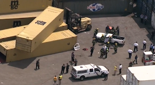 According to Port Authority officials, it appears what's called a top pick or top reacher, a piece of equipment that lifts the large shipping containers, knocked a stack of them accidentally.