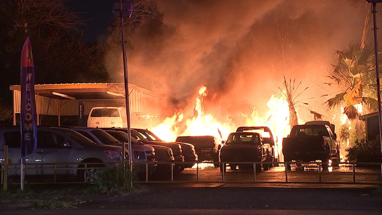 SOUTH HOUSTON, Texas (KTRK) -- A large fire engulfed a warehouse and several vehicles in a neighboring car dealership overnight in South Houston.