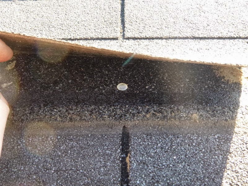 of the top shingle tab to the adhesive strip below. Many times we observe high-nailing the