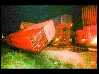The derailment was blocking one highway-rail grade crossing at Inskip Road. Sections of the tracks were moved nearly 15 feet from their original location during the derailment, and double-stacked shipping containers had been severely disfigured and were leaning at perilous angles over what was left of the chain-link fence around the tracks.