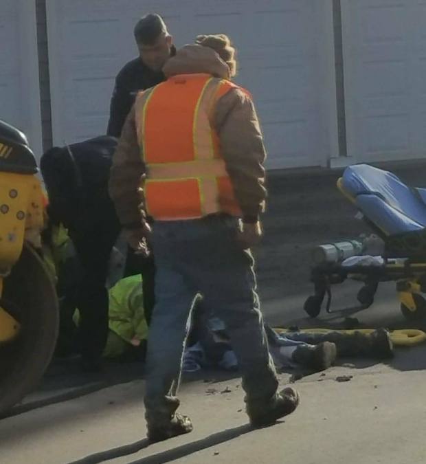 man lies on the ground Tuesday near a road roller, used to compact