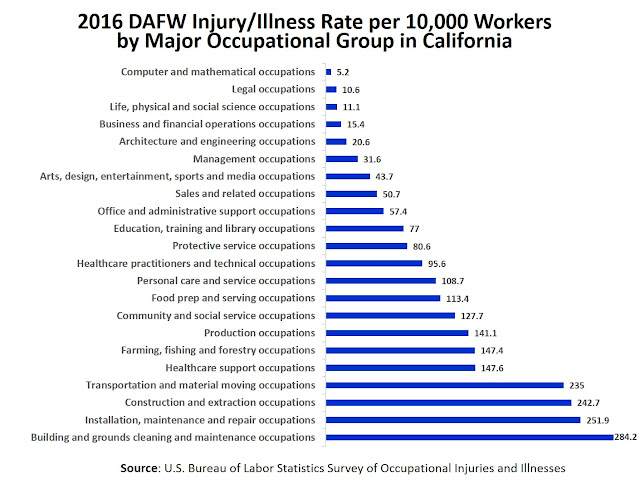 By occupation, the highest DAFW rates were highest in 2016 for cleaning and maintenance workers (284 cases per 10,000 workers), those performing installation and repairs (252 cases), and construction (243 cases). Estimates for the California Survey of Occupational Injuries and Illnesses are derived from a statistical sample of employers in the state. The SOII program is administered by the US Bureau of Labor Statistics (BLS) in cooperation with participating state agencies. Surveyed employers report data as required by the Occupational Safety and Health Administration (OSHA) Recordkeeping regulation (29 CFR 1904), using the OSHA 300 Log.
