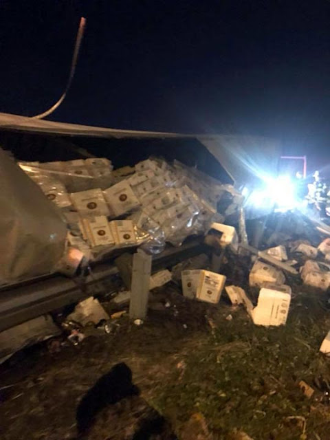 This stupid truck driver was going too fast and failed to negotiate the curve at the ramp. This is so typical crash. He ought to have slowed down, as this Vodka boxes load was not secure and it may have moved as he was going too fast around the curve.