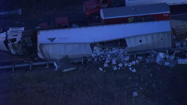 An overturned tractor-trailer carrying bottles of vodka caused the closure of a busy I-95 ramp in Pennsylvania Thursday morning.